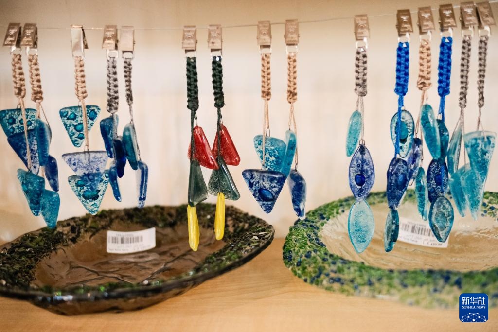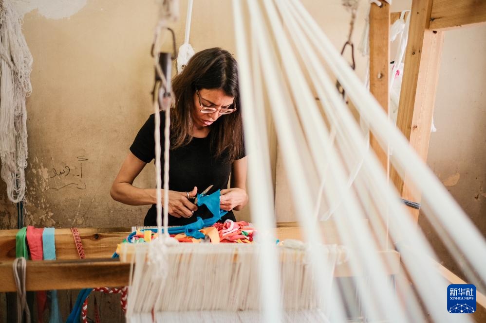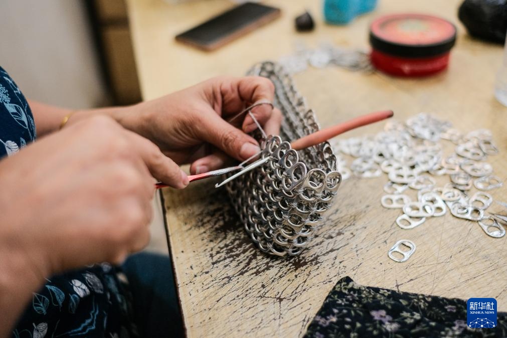 4月21日,在坐落埃及开罗“废物城”的手艺作坊内,工作人员用易拉罐拉环制造环扣包。