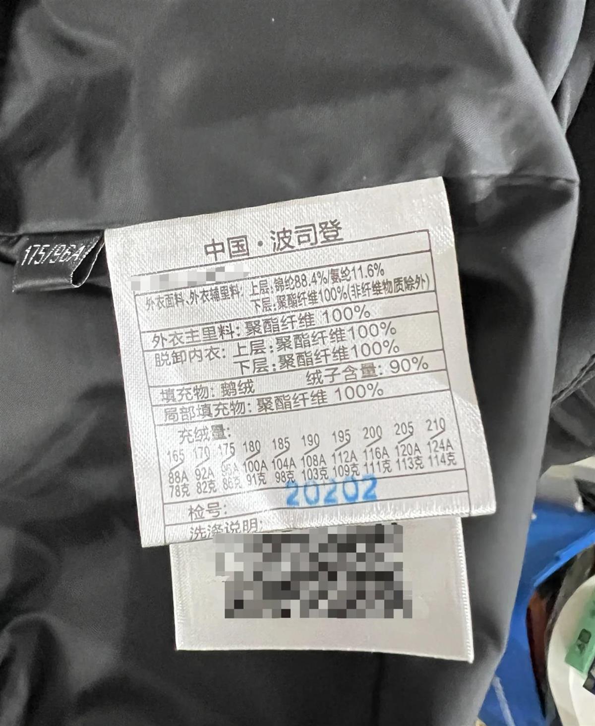 近来,有江苏网友发文称,波司登门店一款价格2000多元的羽绒服,充绒量只要86克,质疑品牌溢价过高。水洗标图片显现,衣服尺码为“175”,对应的充绒量为86克。